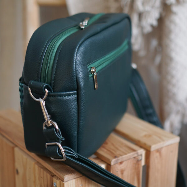 Listonoszka Sophie została uszyta z wysokiej jakości skóry tapicerskiej o ciekawej, wyrazistej strukturze. To mocna, trwała skóra ekologiczna w pięknym odcieniu ciemnej zieleni. Kolorowa kieszonka dodaje jej charakteru i sprawia, że torebka z pewnością zachwyci niejedną osobę. Pasek również został wykonany z tej samej skóry, dzięki czemu całość prezentuje się spójnie i elegancko.