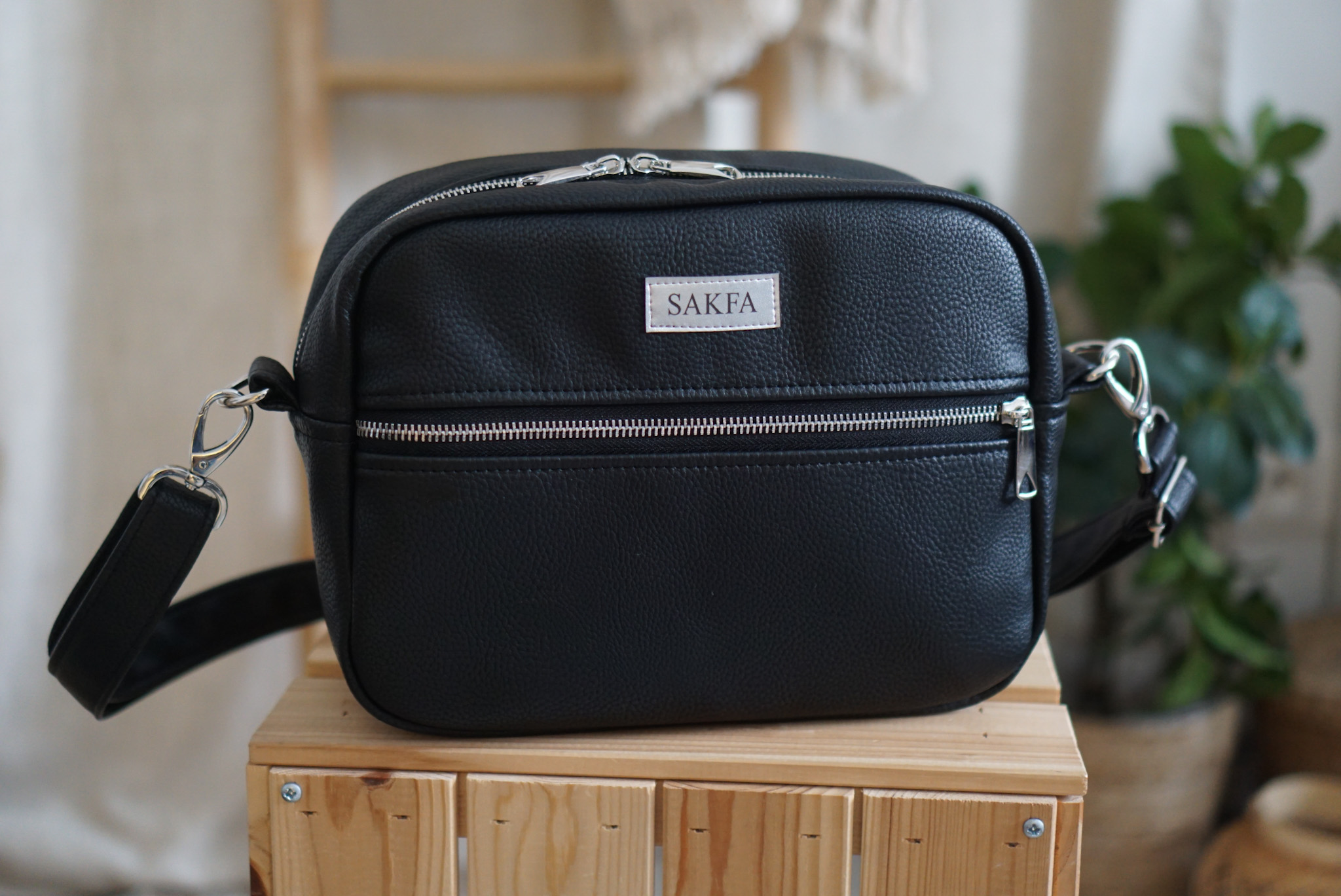 Listonoszka Sophie została uszyta z wysokiej jakości skóry tapicerskiej o ciekawej, wyrazistej strukturze. To mocna, trwała skóra ekologiczna w klasycznym czarnym kolorze. Pasek również został wykonany z tej samej skóry, dzięki czemu całość prezentuje się spójnie i elegancko.