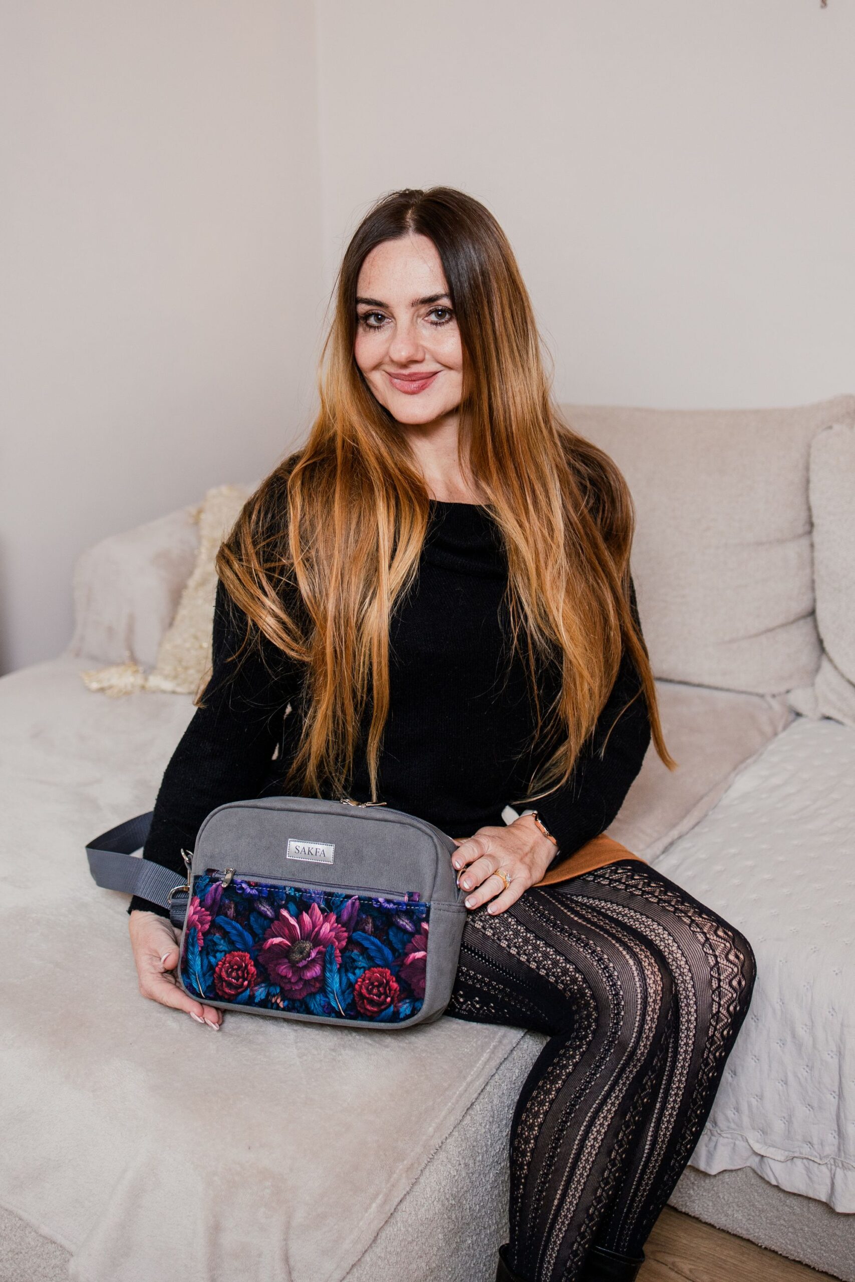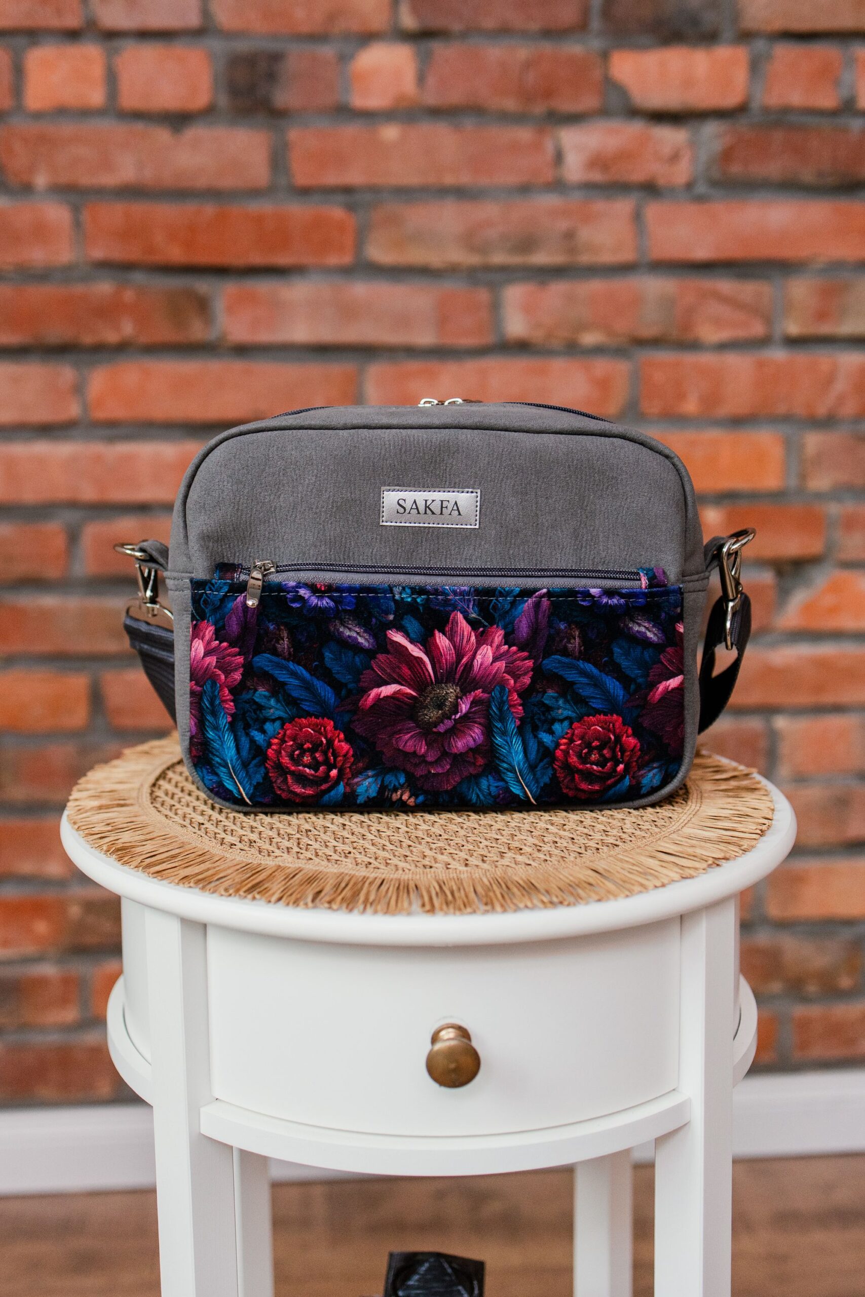 Listonoszka została uszyta z mocnej tapicerskiej tkaniny przypominającej swoimi właściwościami skórkę nubuk w pięknym kolorze. Klasyczna szarość torebki przełamana kwiatowym motywem na welurowej kieszonce pewnością zachwyci niejedną osobę. Listonoszka Sophie to torebka stworzona dla kobiet przez kobiety!