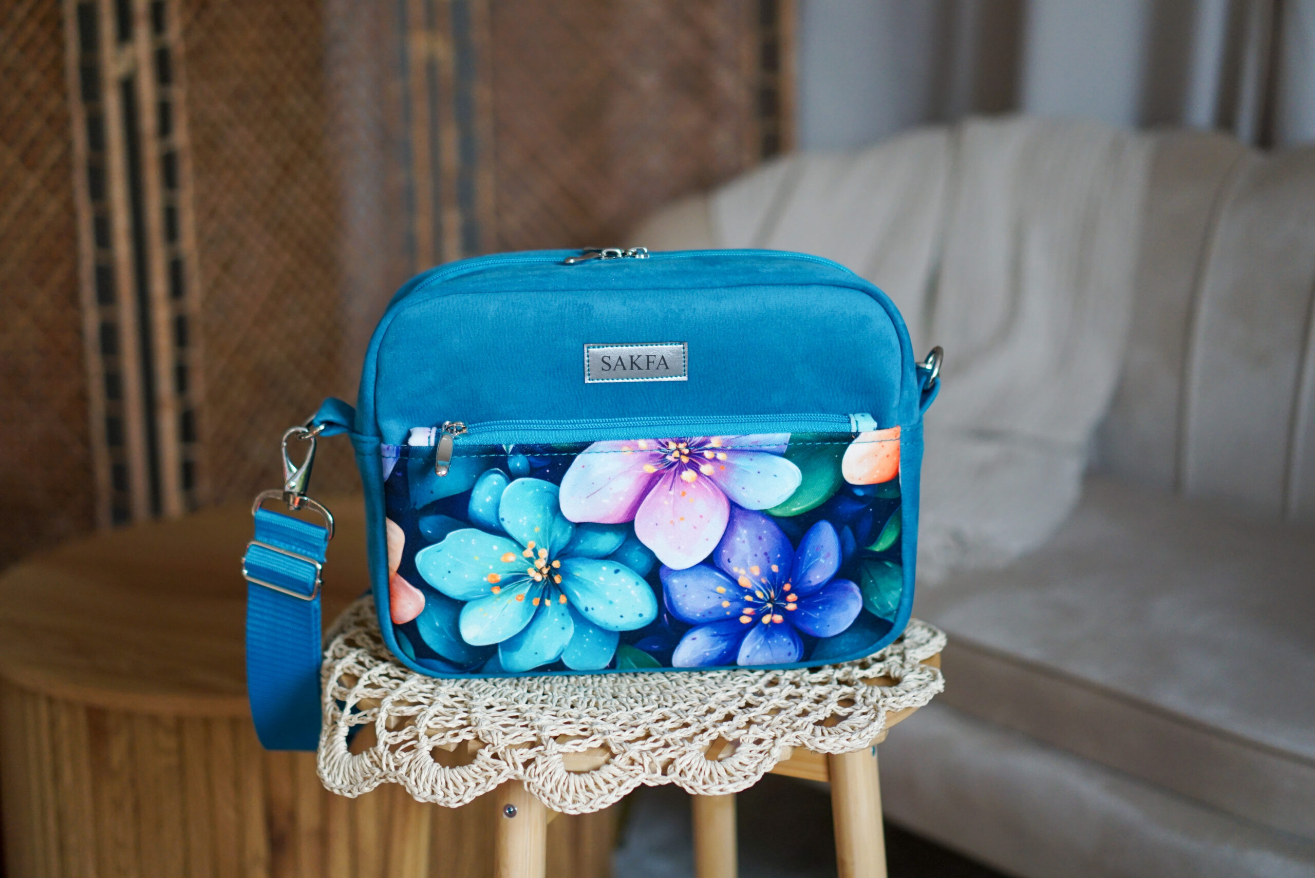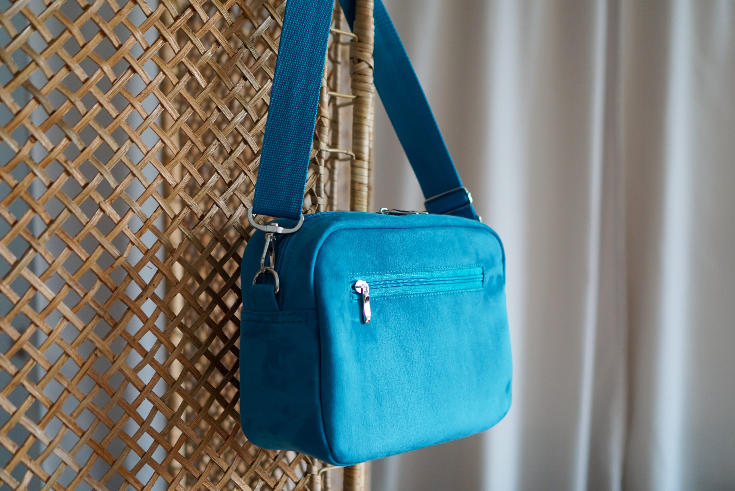 Listonoszka została uszyta z mocnej tapicerskiej tkaniny przypominającej w dotyku skórkę nubuku, w wyjątkowym odcieniu indygo. Głęboki kolor w połączeniu z kolorową kieszonką tworzy efekt, obok którego trudno przejść obojętnie. Listonoszka Sophie to torebka stworzona dla kobiet przez kobiety!