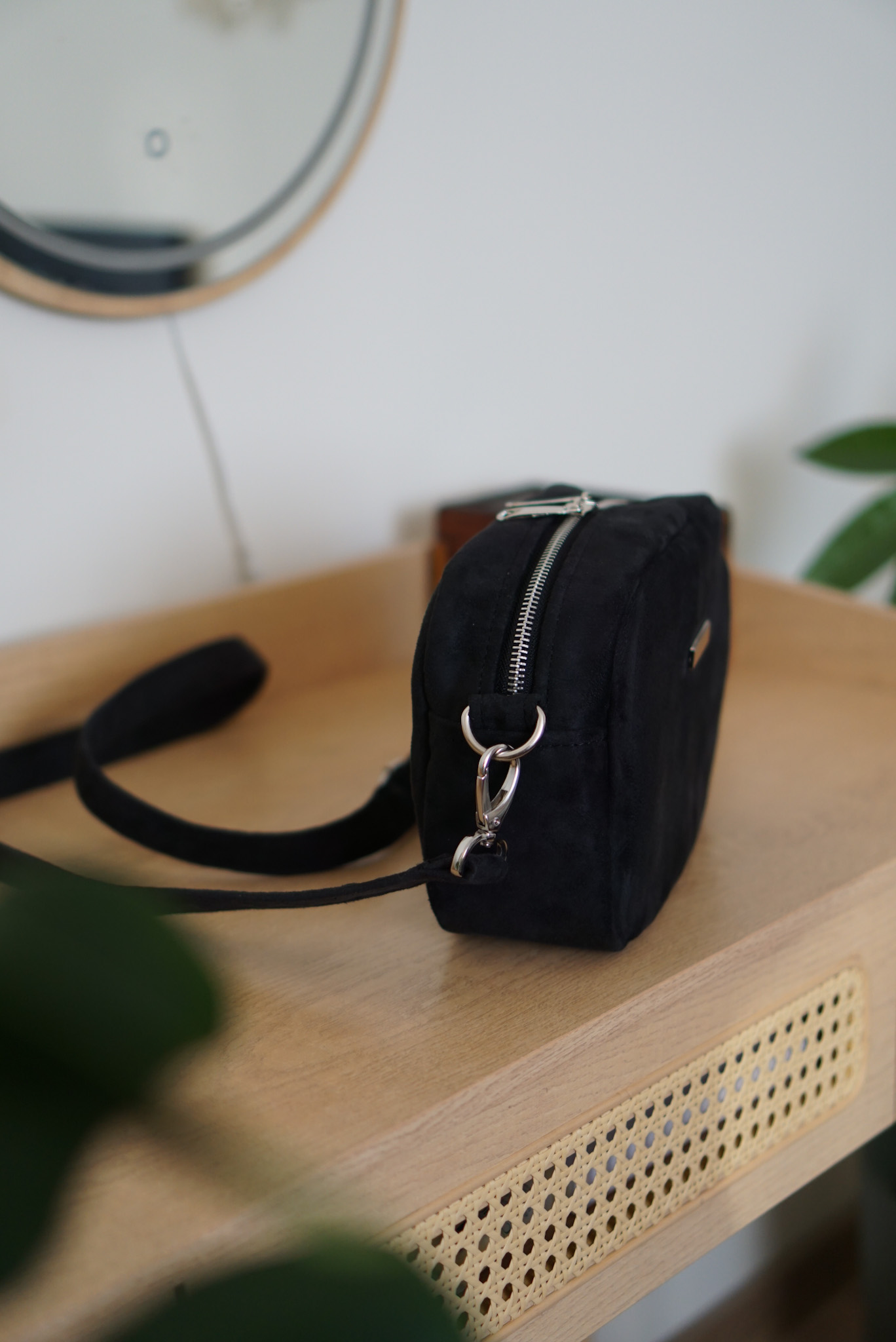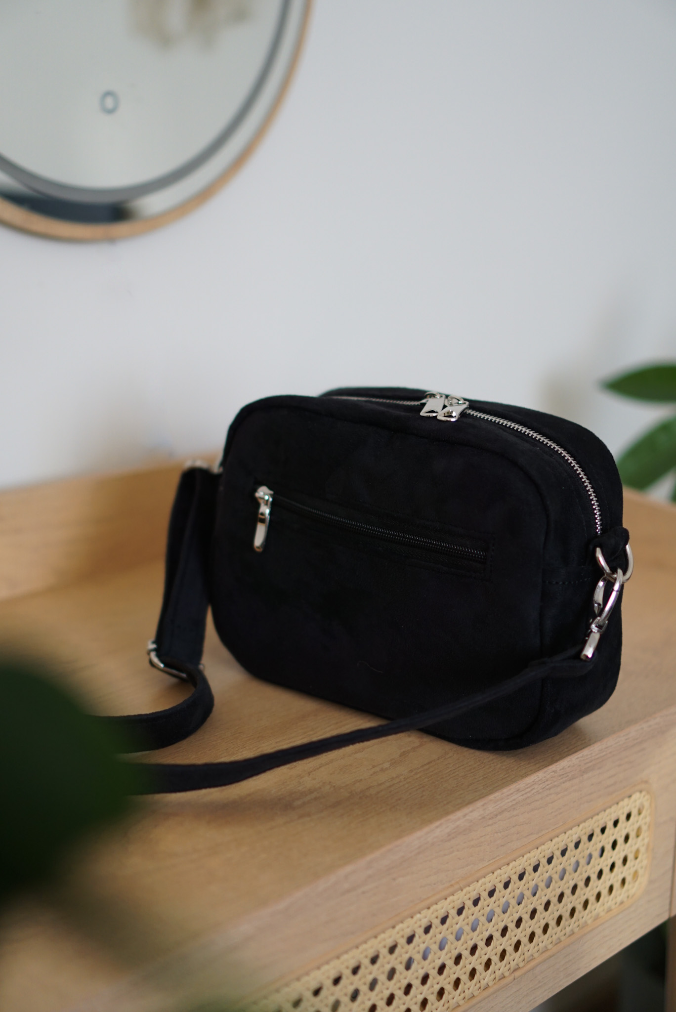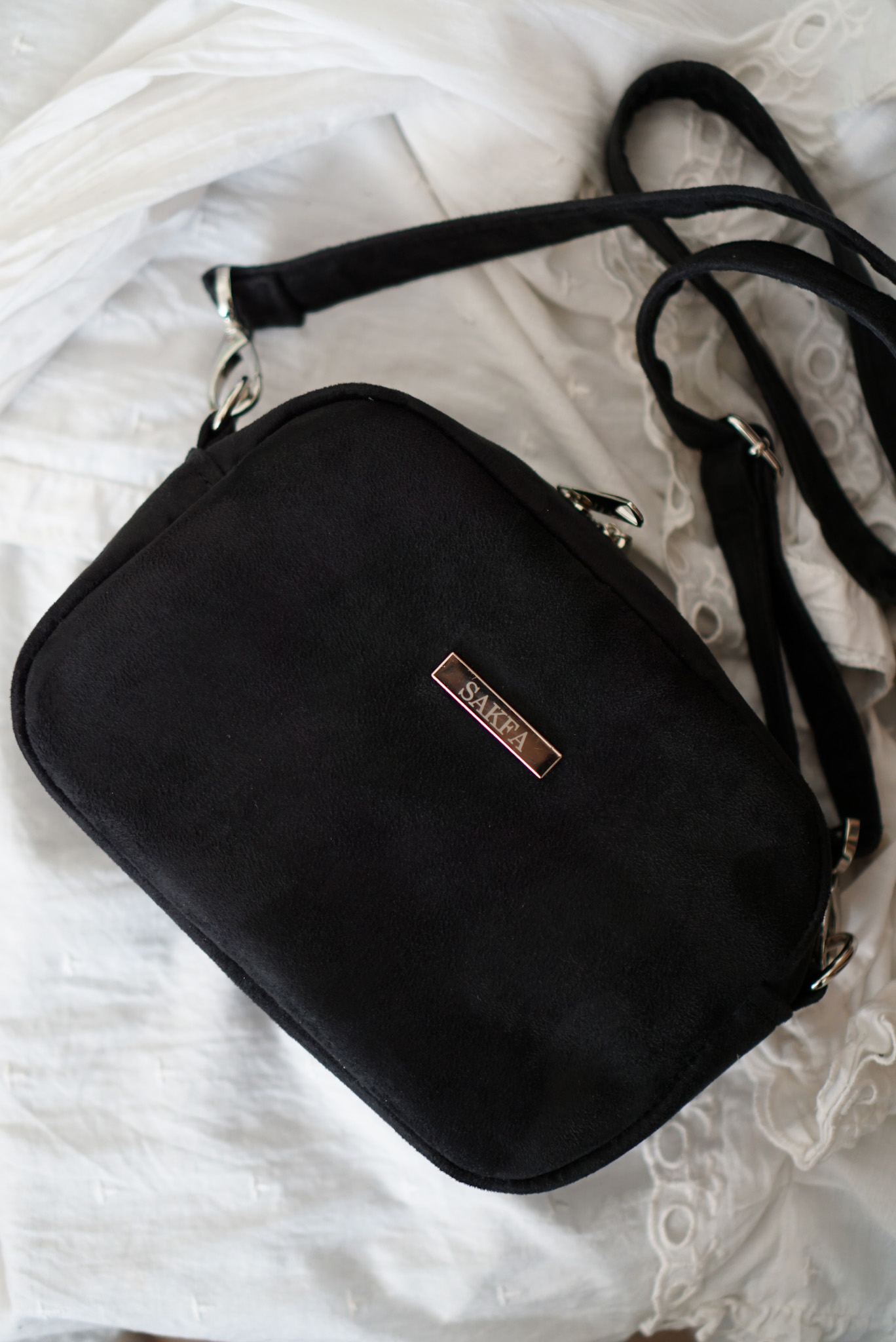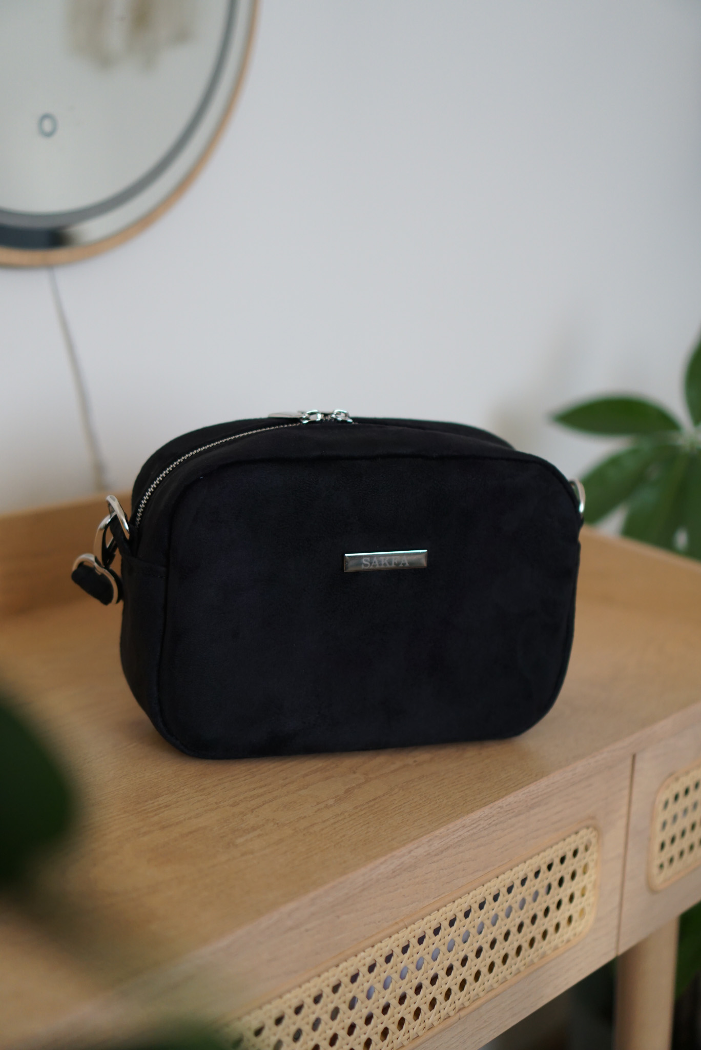 Sophie MINI została uszyta z wysokiej jakości tapicerskiego zamszu syntetycznego o miękkiej, przyjemnej w dotyku fakturze. Ten mocny i trwały materiał w eleganckim czarnym kolorze prezentuje się wyjątkowo stylowo. Gładki front dodaje jej klasy, a pasek wykonany z tego samego materiału tworzy spójną i nowoczesną całość.
