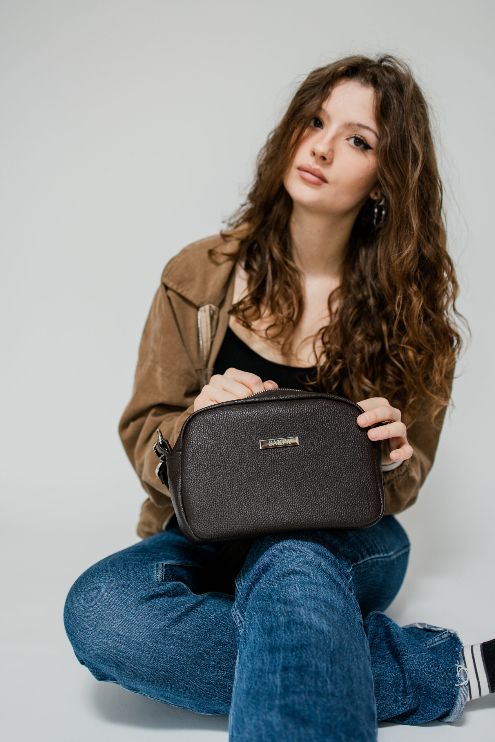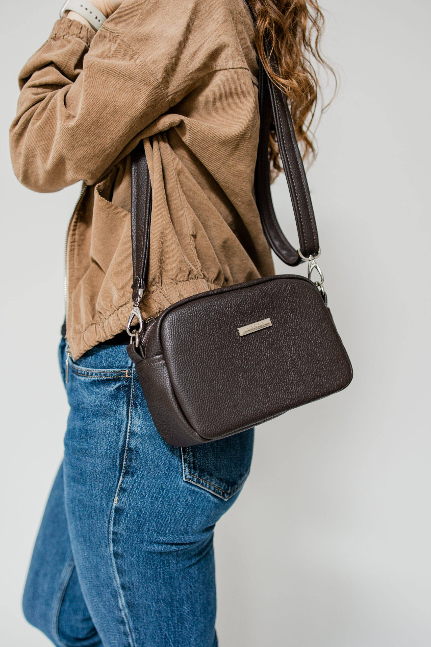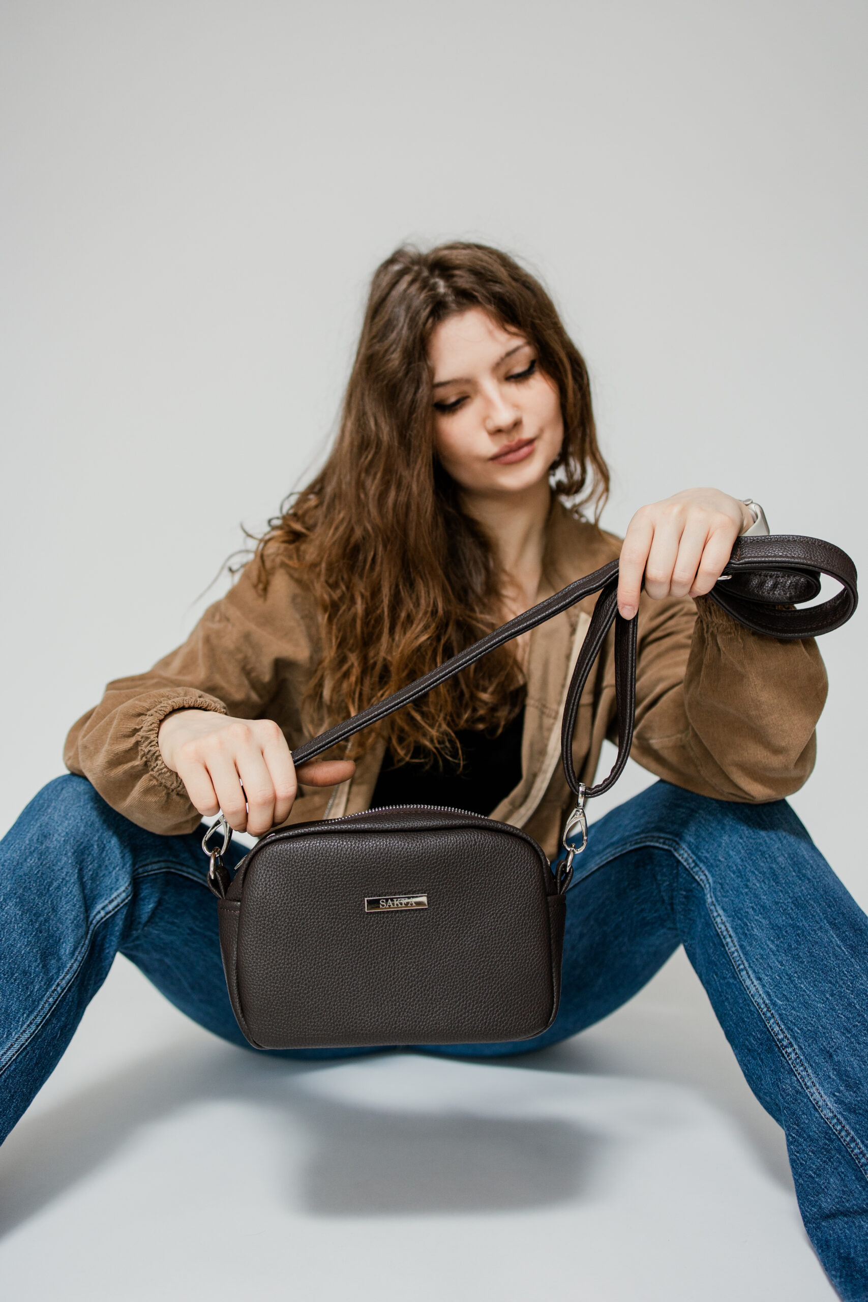 Sophie MINI została uszyta z wysokiej jakości skóry tapicerskiej o wyrazistej, ciekawej strukturze. To mocna i trwała skóra ekologiczna w pięknym odcieniu ciemnego brązu. Gładki front nadaje jej elegancji, a pasek wykonany z tej samej skóry tworzy spójną i stylową całość.