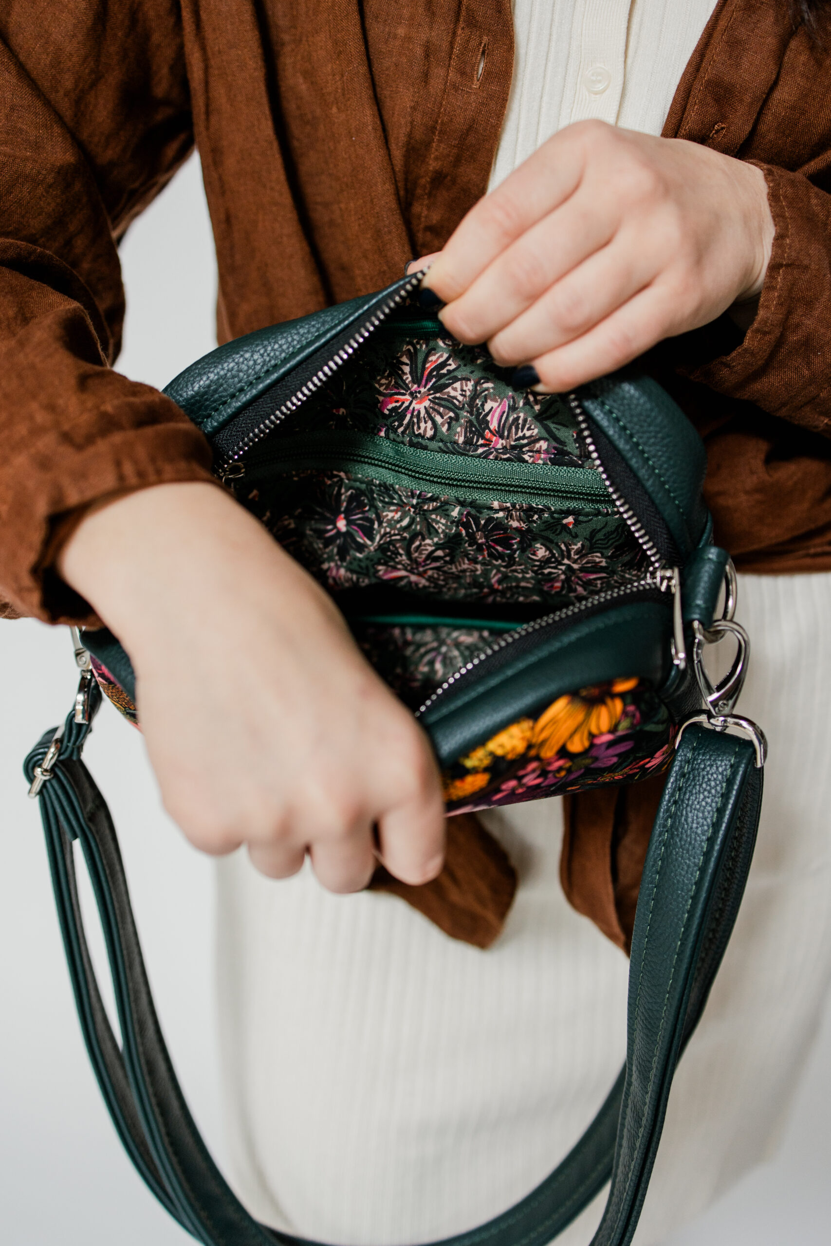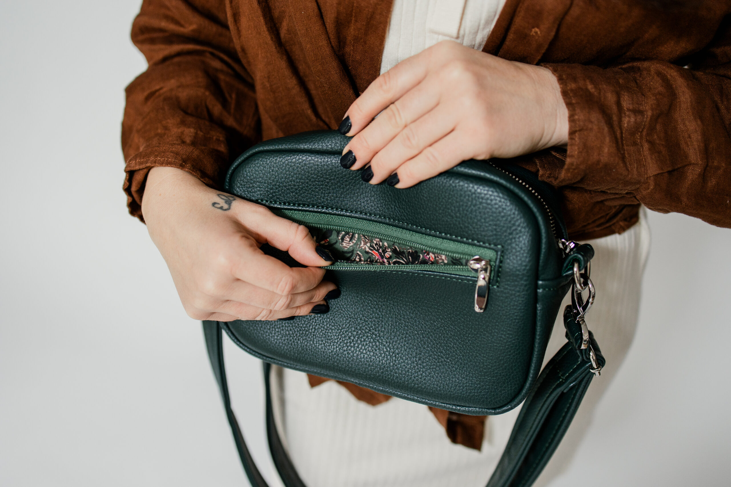 Sophie MINI została uszyta z wysokiej jakości skóry tapicerskiej o wyrazistej, ciekawej strukturze. To mocna i trwała skóra ekologiczna w pięknym butelkowym kolorze. Kolorowy front nadaje jej oryginalności, a pasek wykonany z tej samej skóry tworzy spójną i stylową całość.