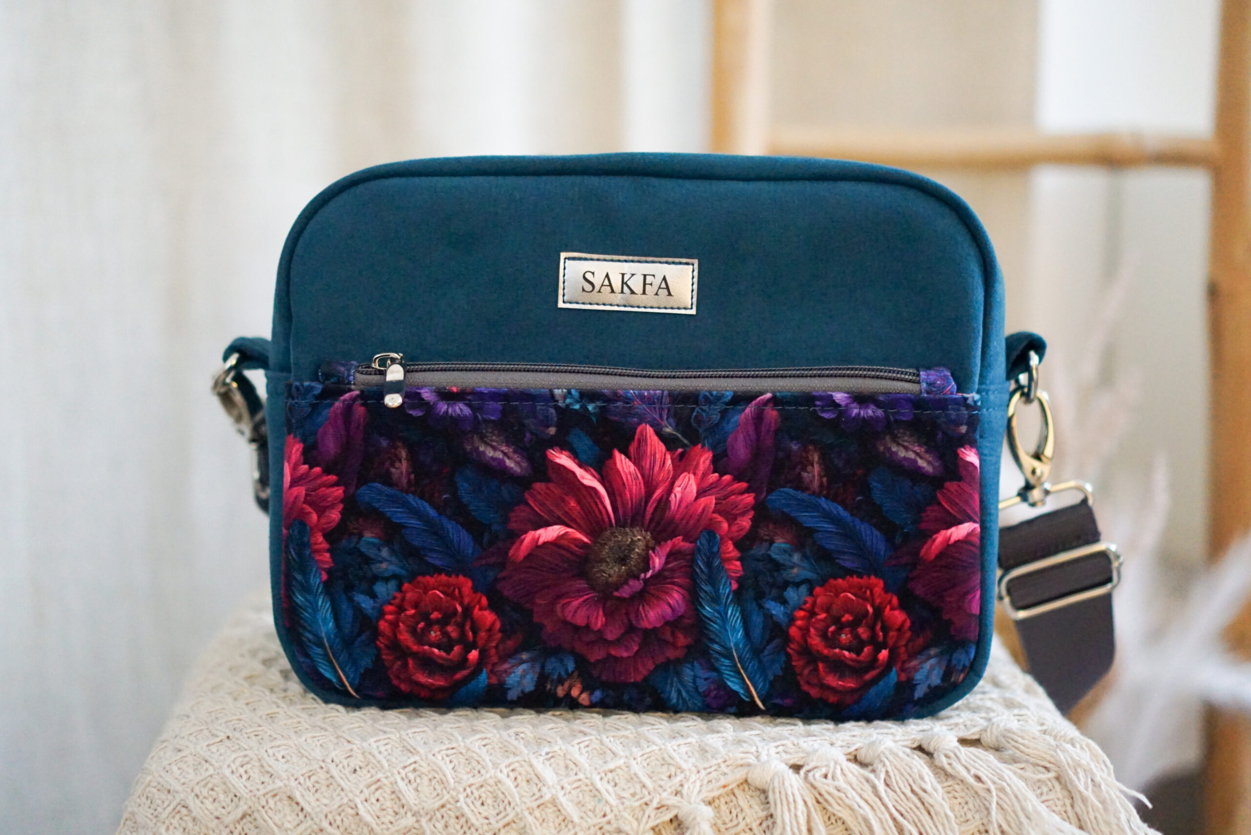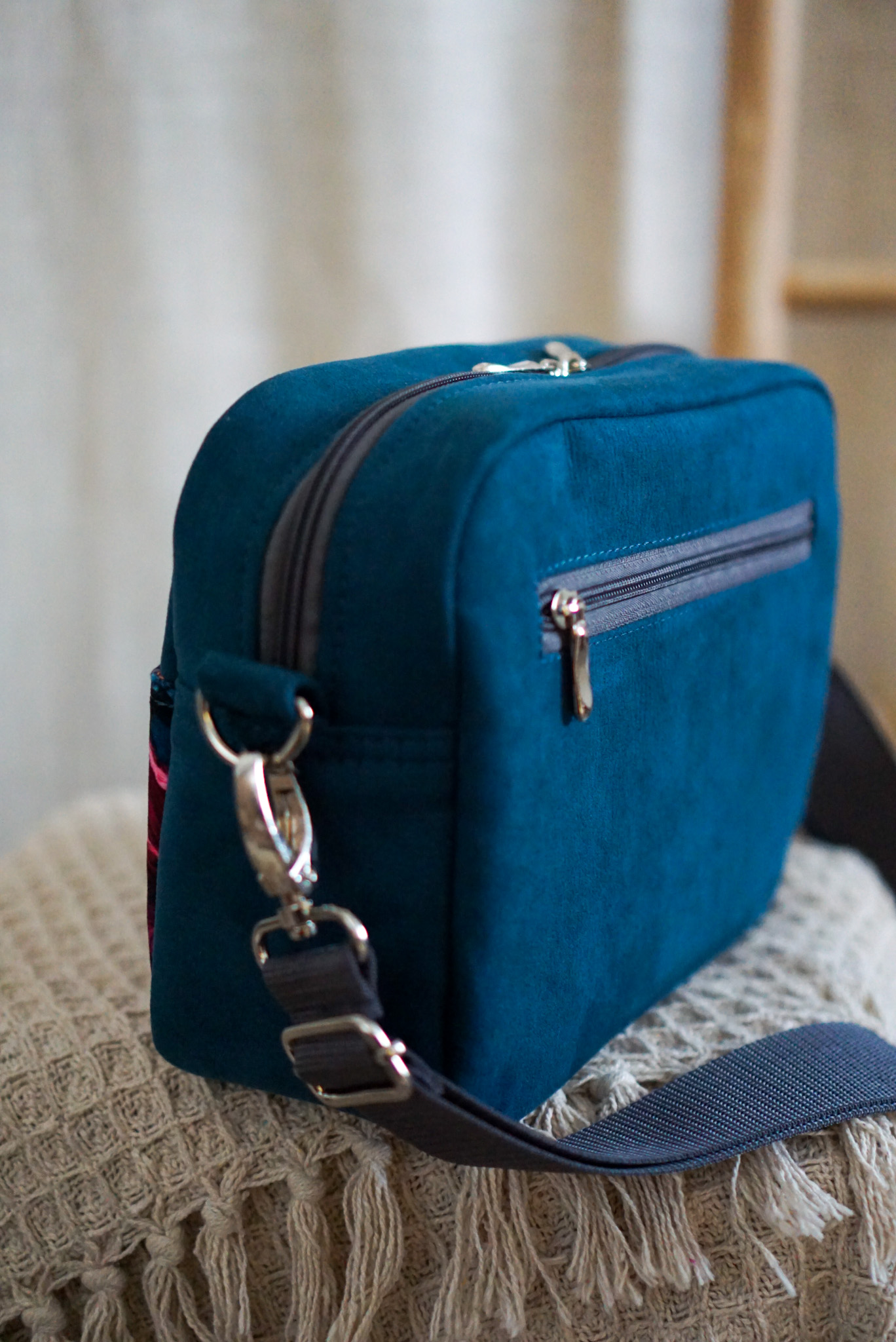 Listonoszka została uszyta z mocnej tapicerskiej tkaniny przypominającej swoimi właściwościami skórkę nubuk w pięknym kolorze. Turkusowy kolor torebki połączony z kolorową kieszonką z pewnością zachwyci niejedną osobę. Listonoszka Sophie to torebka stworzona dla kobiet przez kobiety!