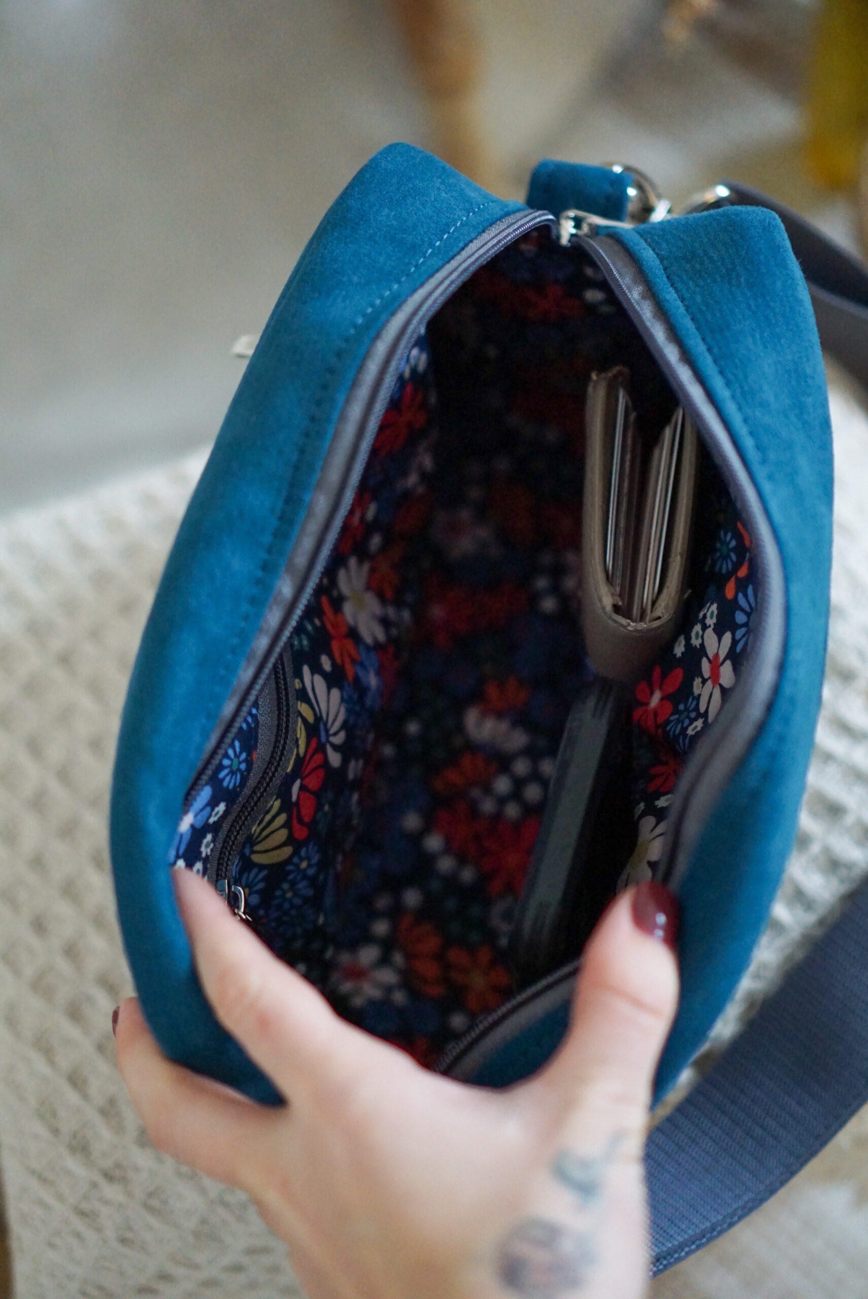 Mała listonoszka Sophie – niech nie zmyli Cię jej rozmiar! Mała, ale jaka pojemna i w dodatku z dużą ilością kieszonek. Środek skrywa bawełnianą podszewkę i trzy kieszonki w tym jedną zapinaną na zamek! Dodatkowe dwie znajdują się na przodzie i z tyłu naszej listonoszki. Z taką ilością kieszonek zapomnisz o bałaganie. Klucze, telefon, dokumenty, długopisy – wszystko piękne schowane. W dodatku jej rozmiar pozwala na spakowanie kalendarza czy planera.