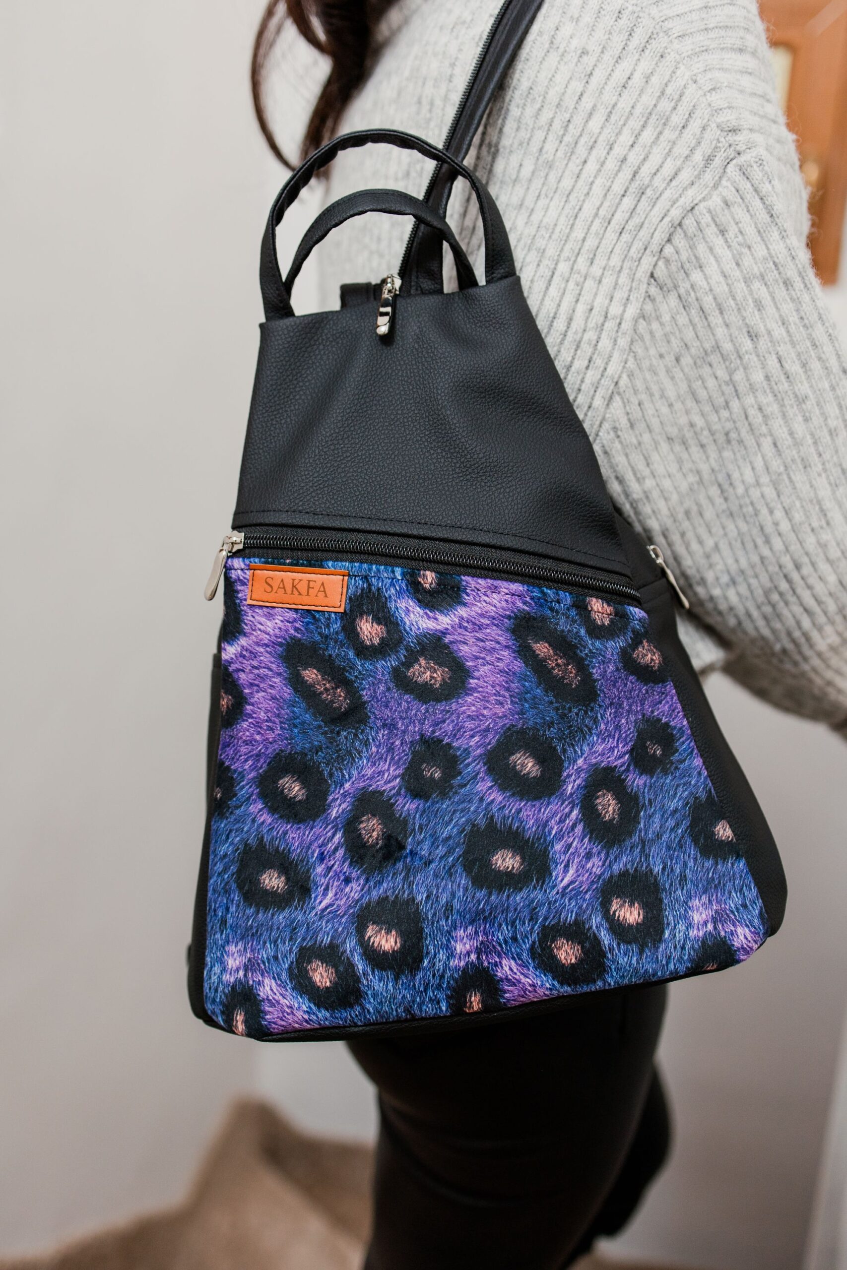 DETALE: Kolejne porcje materiału wychodziły z naszych maszyn z niezwykłą starannością. Plecak wyposażyłyśmy w jedną, dużą kieszeń, w której znajdują się dwie małe i jedna większa, zasuwana na suwak. Doskonale sprawdzą się podczas segregacji drobiazgów. Z przodu suwak wyznacza granicę pomiędzy dwoma printami, a ukryta pod nim kieszonka spokojnie zmieści okulary przeciwsłoneczne, chusteczki i kilka innych niewielkich przedmiotów, które chcesz mieć pod ręką. To jednak nie koniec kieszonkowych zakamarków. W trosce o bezpieczeństwo od wewnętrznej strony umieściłyśmy kieszonkę, która spokojnie zmieści Twój telefon. Dodatkowo będziesz miała do niego bardzo łatwy dostęp.