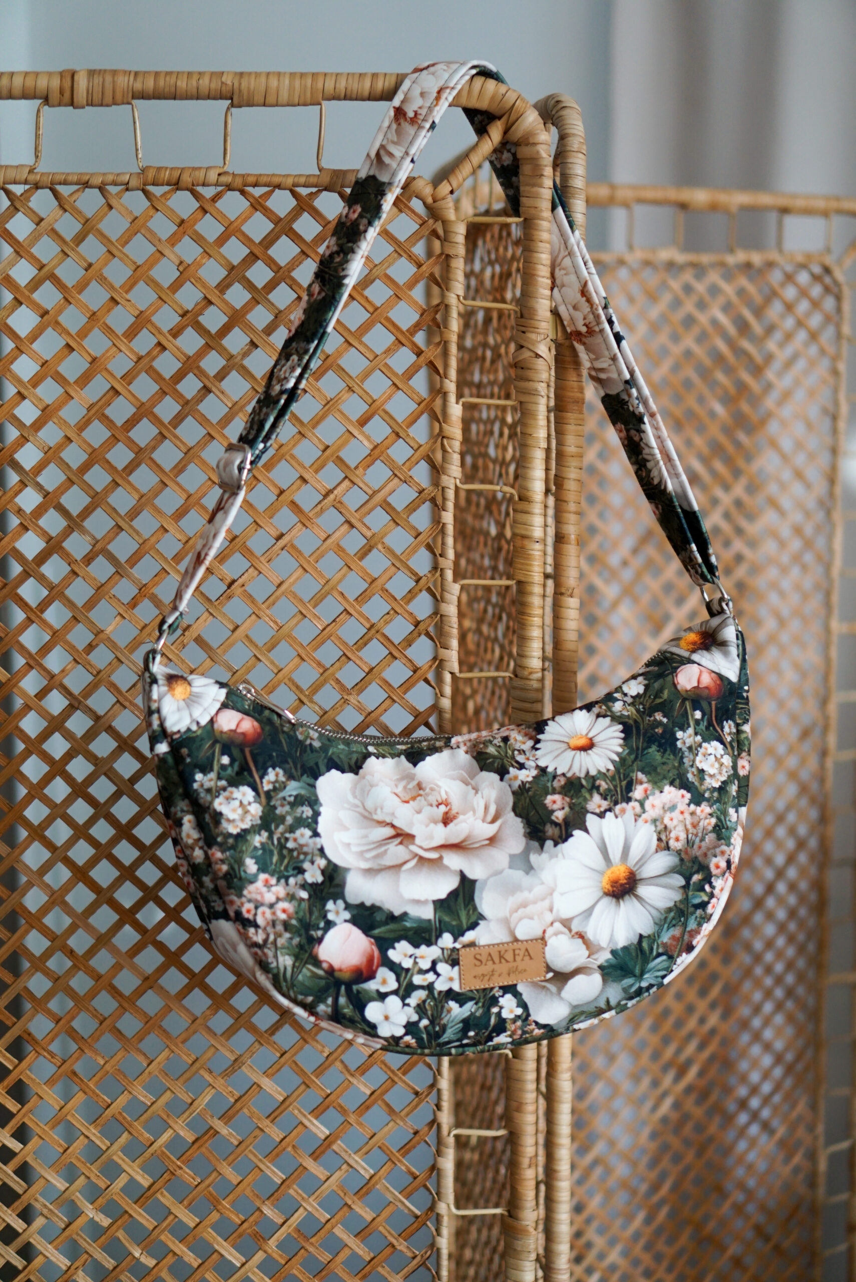 Torebka welurowa półksiężyc Luna – Stokrotki i piwonie