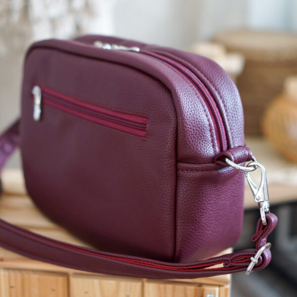 Listonoszka Sophie została uszyta z wysokiej jakości skóry tapicerskiej o ciekawej, wyrazistej strukturze. To mocna, trwała skóra ekologiczna w pięknym odcieniu bordo. Kolorowa kieszonka dodaje jej charakteru i sprawia, że torebka z pewnością zachwyci niejedną osobę. Pasek również został wykonany z tej samej skóry, dzięki czemu całość prezentuje się spójnie i elegancko.
